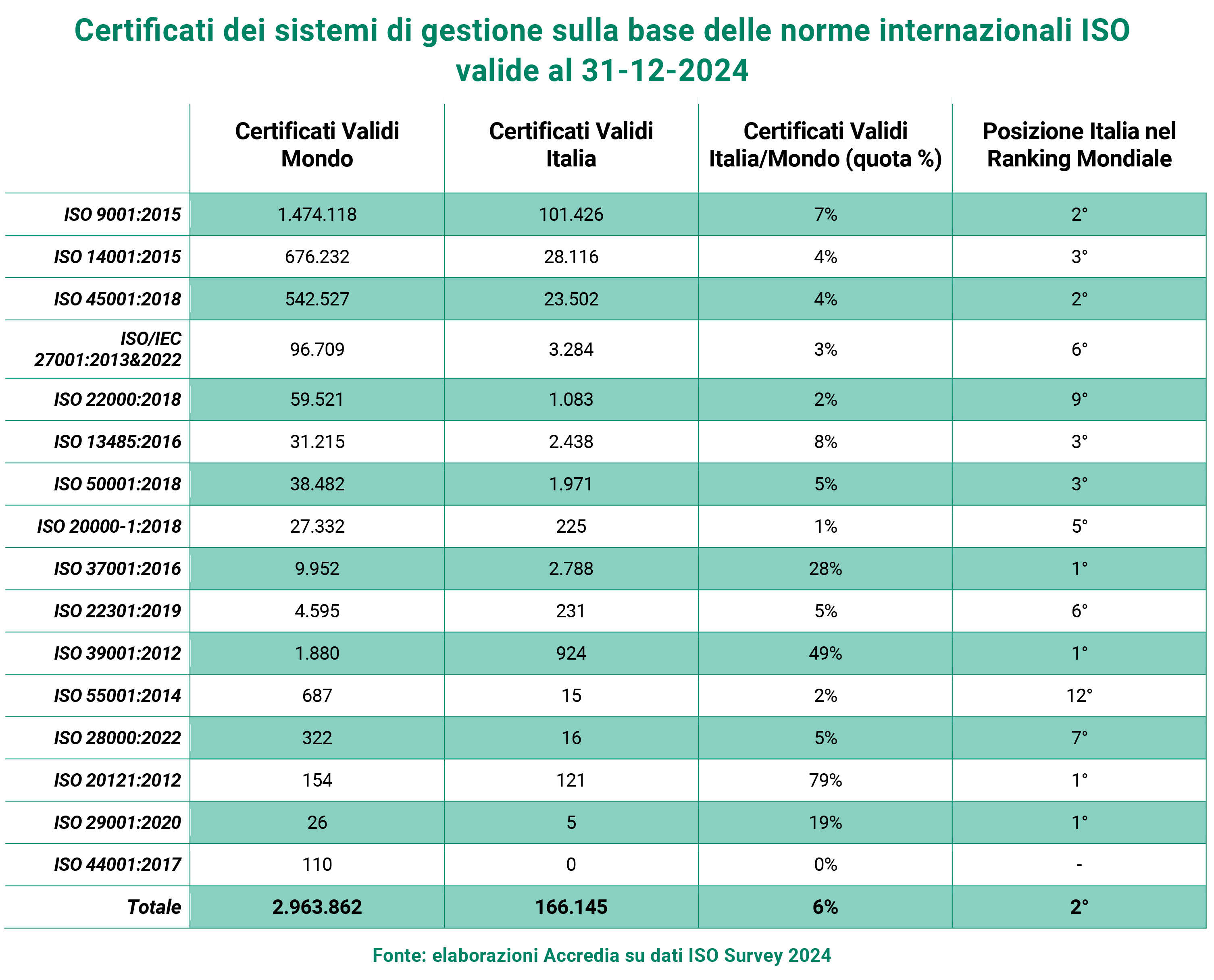 Secondo i dati dell’ISO Survey 2024, alla data del 31 dicembre 2024, il numero totale di certificati attivi nel mondo ha raggiunto circa 3 milioni. In Italia i certificati superano quota 166mila, rafforzando la posizione del nostro Paese ai vertici del ranking mondiale.