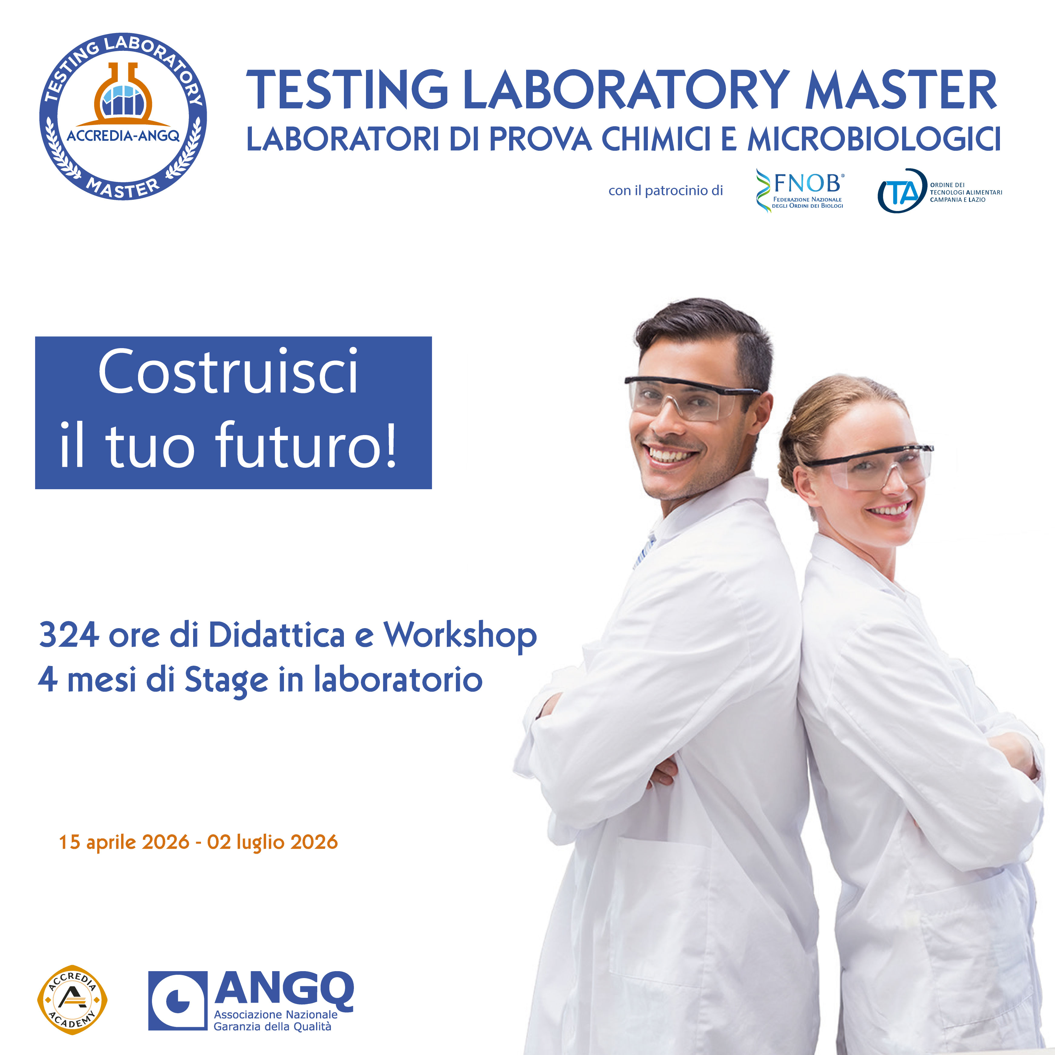 Dopo il successo della prima edizione, torna il Testing Laboratory Master promosso da Accredia, attraverso la divisione Academy, e dall’Associazione Nazionale Garanzia della Qualità (ANGQ), per preparare i professionisti di domani nel mondo dei laboratori di prova chimici e microbiologici accreditati.